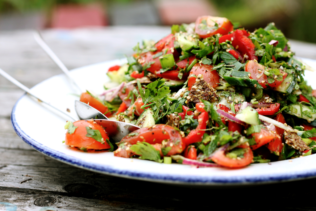 Although it is a well-known Lebanese dish, I actually ate my first plate of this tasty delight in Los Angeles. My friends and I often patronized an off-the-cool-map restaurant in a strip mall because the food was really, really delicious (but also because we could all find something on the menu to suit us – not always the easiest thing!). The fattoush salad serendipitously arrived at our table one day (I can’t even remember ordering it) and lo and behold, I got a taste of the light. What is this incredible stuff?! So lemon-y. So herbalicious. So clean and cool and collectively crisp! And sprinkled with some very tangy red stuff that I later learned was sumac – pure love I tells ya. The whole thing is a plate of genius.